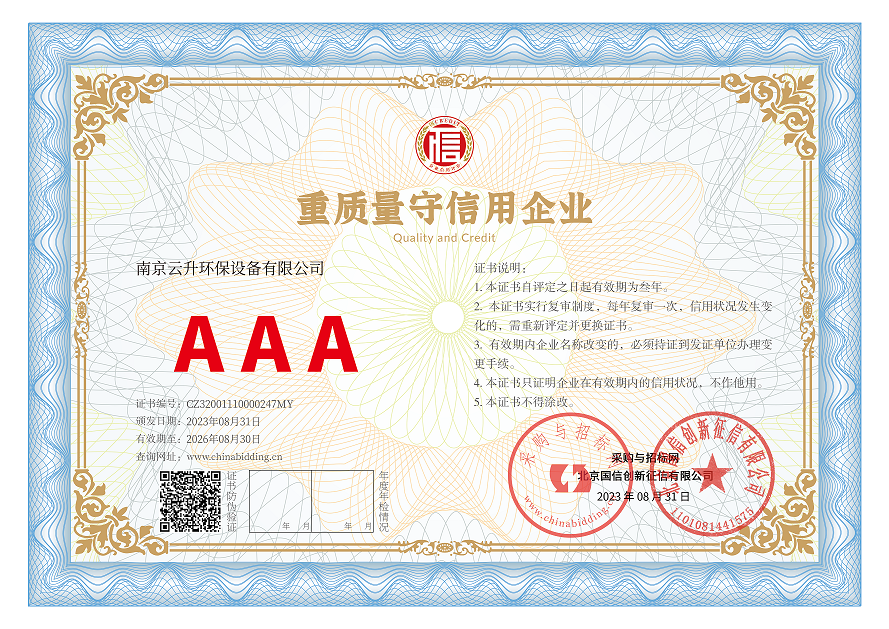 南京云升環(huán)保設(shè)備有限公司全體員工愿以環(huán)境保護(hù)為己任,以市場為導(dǎo)向,以優(yōu)質(zhì)服務(wù)為原則,嚴(yán)格的管理、先進(jìn)的生產(chǎn)工藝、至上的品質(zhì)、完善的售前售后服務(wù),與廣大新老用戶攜手并進(jìn),共鑄輝煌。公司已通過ISO9001:2000質(zhì)量管理體系標(biāo)準(zhǔn)認(rèn)證,成為江蘇省高新企業(yè),并進(jìn)行不斷的技術(shù)改進(jìn)和創(chuàng)新,為客戶和合作伙伴提供滿意的產(chǎn)品。